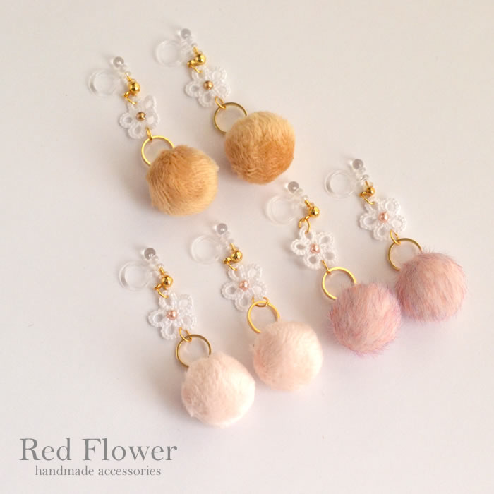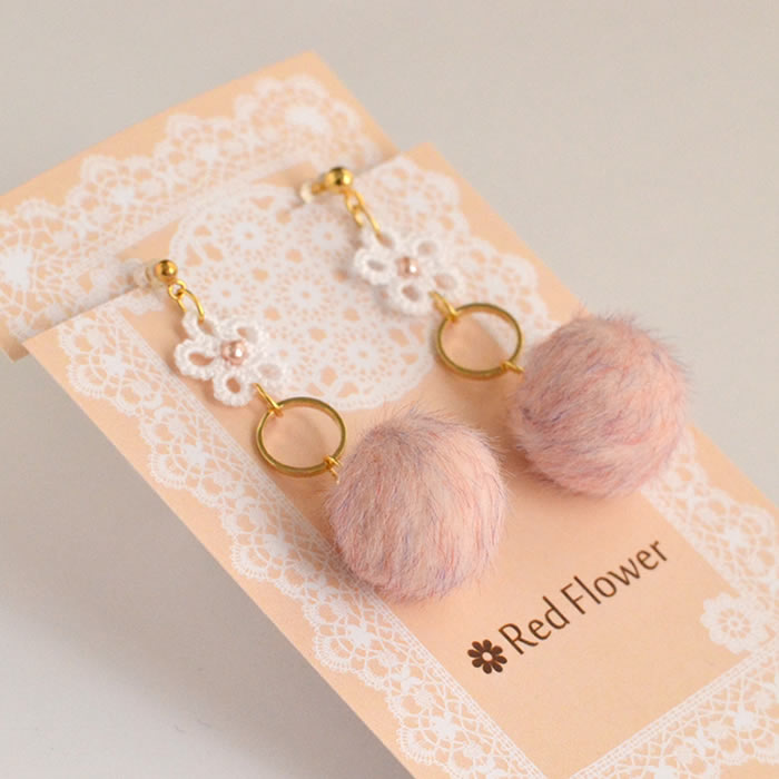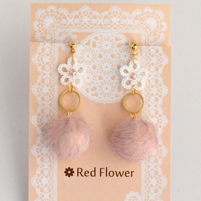 お花とラビットファーボール(濃いピンク) ピアス / イヤリング 秋冬 レース編み